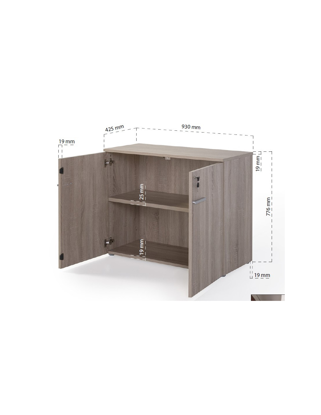 Armario de archivo para oficina, bajo con puertas. Fabricado con materiales melaminados y herrajes de alta calidad, es un armario que, para despachos de dirección, salas de reuniones o en una sala de archivo cumple perfectamente la función a la que va destinado que es tener el archivo ordenado y bajo llave. Mantener los documentos organizados y al alcance es la diferencia entre tener espacios caóticos con falta de espacio y orden o tener espacios optimizados y que sean productivos y eficientes para alcanzar la producción óptima en el trabajo de oficina. Lleva regulador interior para nivelar en caso de que le suelo esté algo inclinado. Servicio exprés, con salida de fábrica en un máximo de 72 horas hábiles.