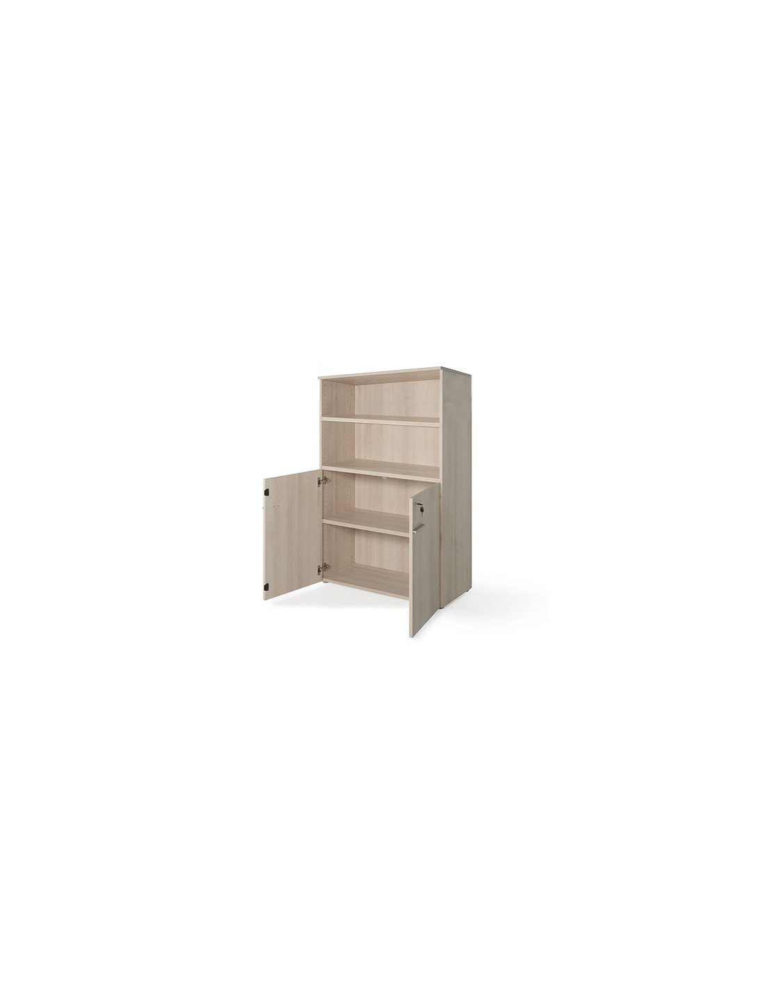 Armario, de medida media, para oficina, con puertas bajas y balda superior abierta. Fabricado con materiales y herrajes de gran calidad, este armario es un gran activo a la hora del trabajo administrativo por la combinación de guardar bajo llave o dejar a la mano lo que se usa diariamente. Lleva reguladores interiores por si el suelo se encuentra con desnivel.