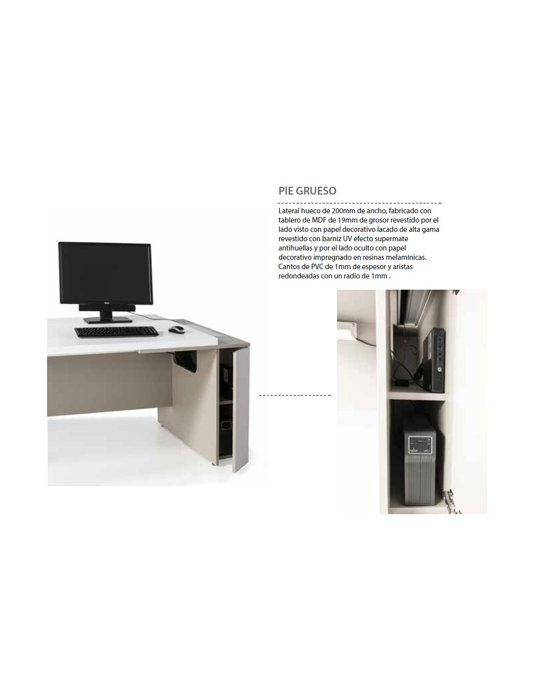Pie grueso | Lateral hueco de 200mm de ancho, fabricado con tablero de MDF de 19mm revestido a ambos lados con papel decorativo y lacado de alta gama revestidos con barniz UV efecto supermate antihuellas, cantos de PVC de 1mm y aristas redondeadas con un radio de 1mm. Posición derecha o izquierda definible en compra |