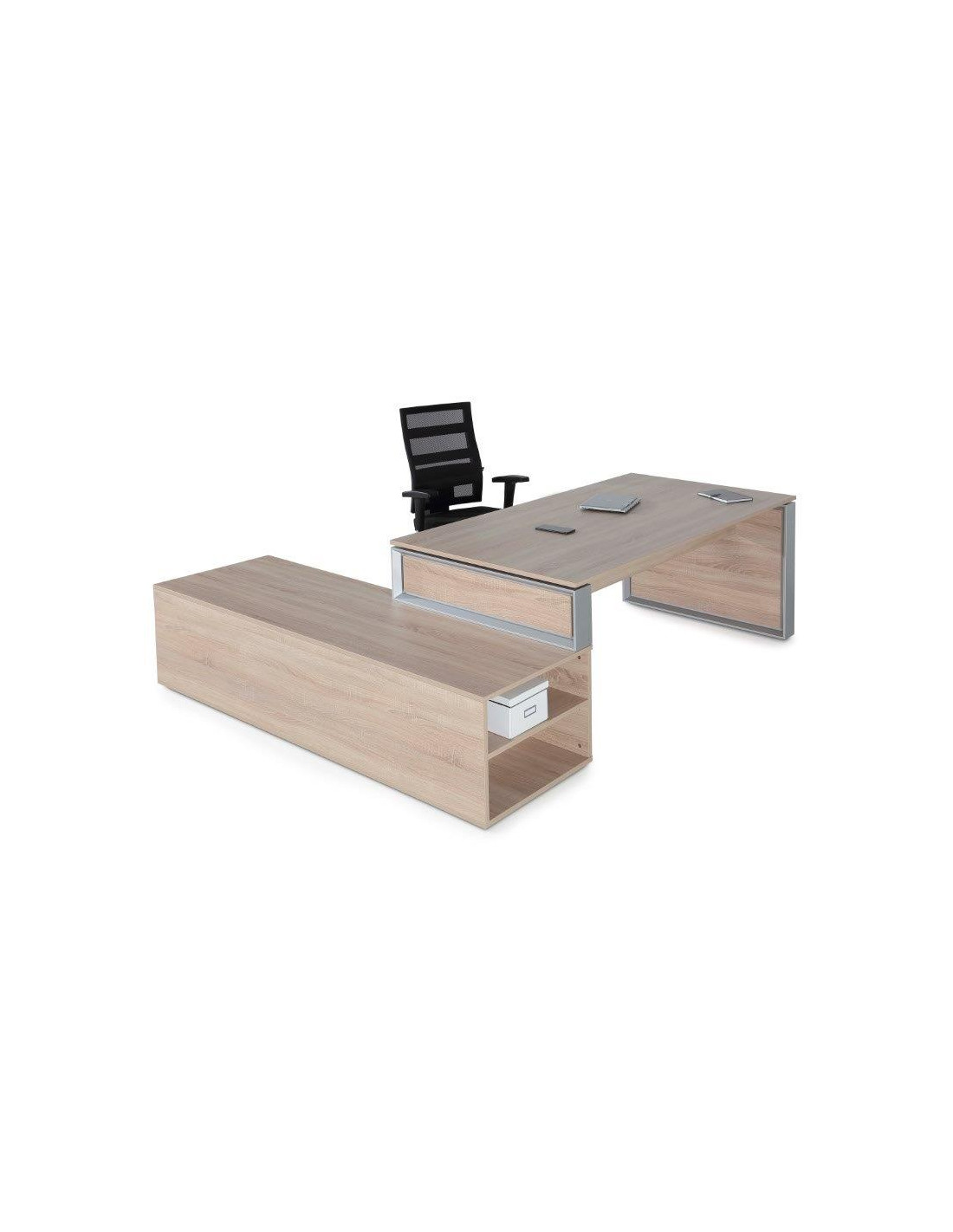 | Faldón | Panel de partículas aglomeradas de 19mm de espesor revestidos por ambos lados con papel decorativo impregnado en resinas melamínicas. Cantos de PVC de 1mm de espesor y aristas redondeadas con un radio de 1mm. Viga metálica de refuerzo bajo la tapa de mesa |