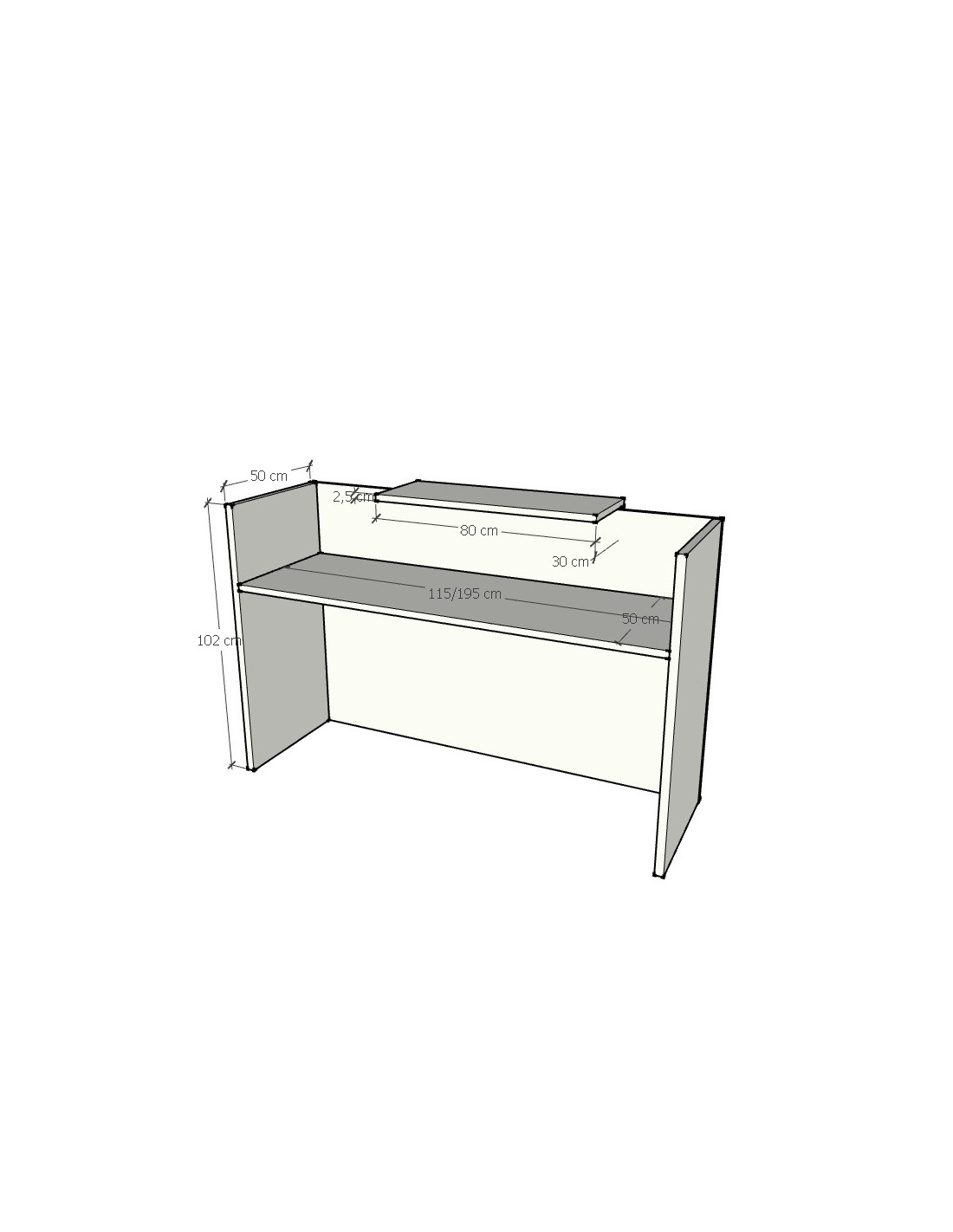 Mostrador Fabricado con panel de partículas aglomeradas de 25mm de grosor revestidas por ambos lados con papel decorativo impregnado en resinas melamínicas. Siempre de color blanco.
