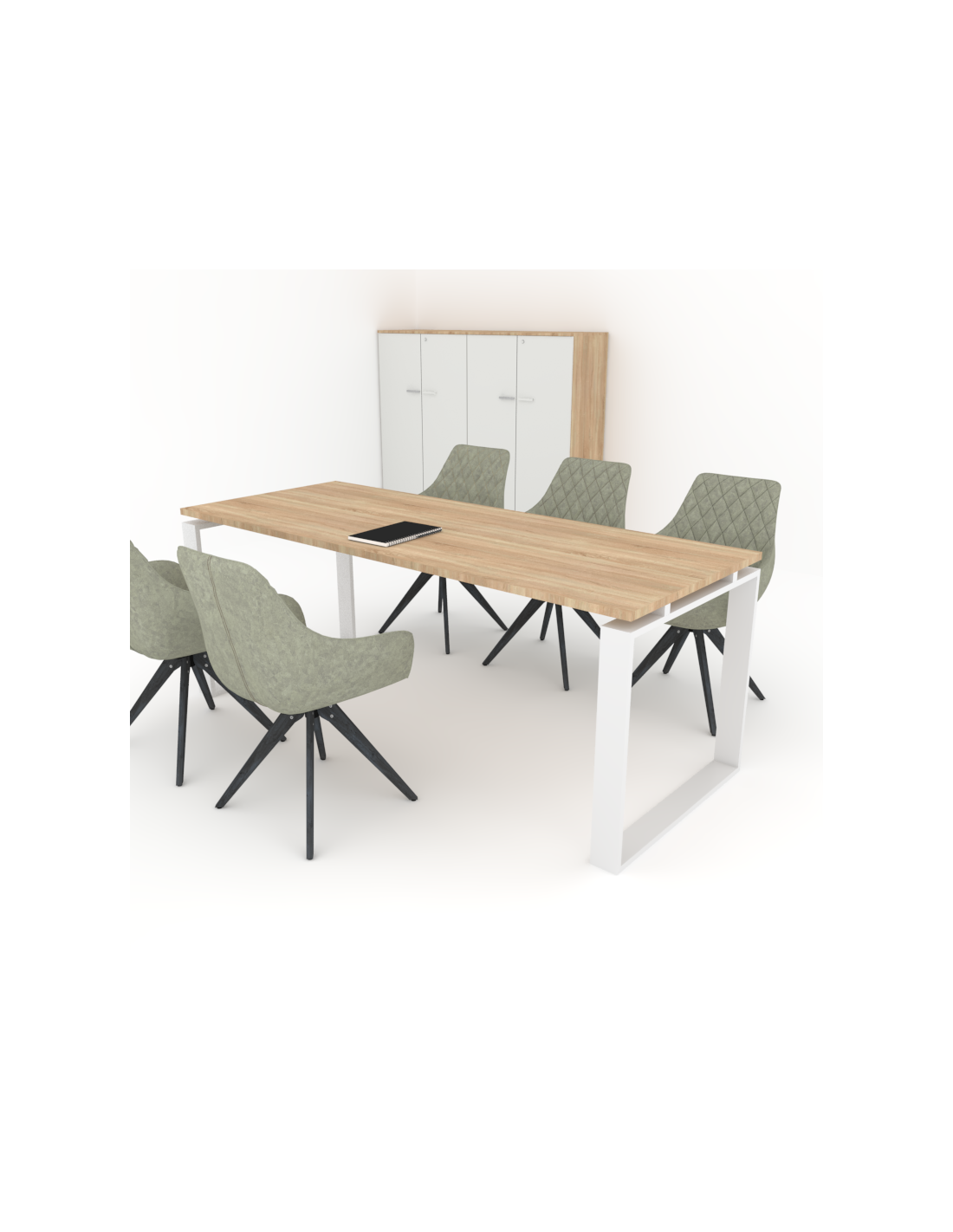 | Mesa | Tapa de la mesa fabricada con un tablero canteado y laminado de 25mm de espesor. Estructura metálica, de dos patas con forma de cuadrado, fabricadas en tubo con una sección de 80x20mm. Largueros metálicos, de refuerzo, en tubo de 30x30mm, bajo la tapa de mesa. Opcionalmente, se puede añadir la posibilidad de instalar pasacables en la superficie de la mesa. |