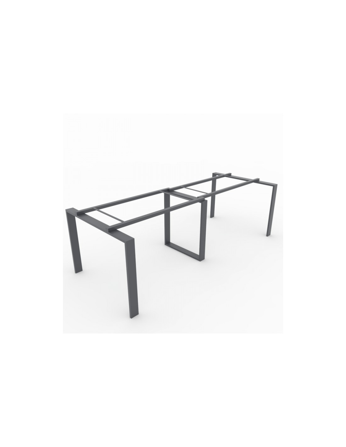 Mesa Tapa de la mesa fabricada con un tablero canteado y laminado de 25mm de espesor. Estructura metálica, de dos patas con forma de U invertida y una central en forma de cuadrado, fabricadas en tubo con una sección de 80x20mm. Largueros metálicos, de refuerzo, en tubo de 30x30mm, bajo la tapa de mesa. Opcionalmente, se puede añadir la posibilidad de instalar pasacables en la superficie de la mesa.