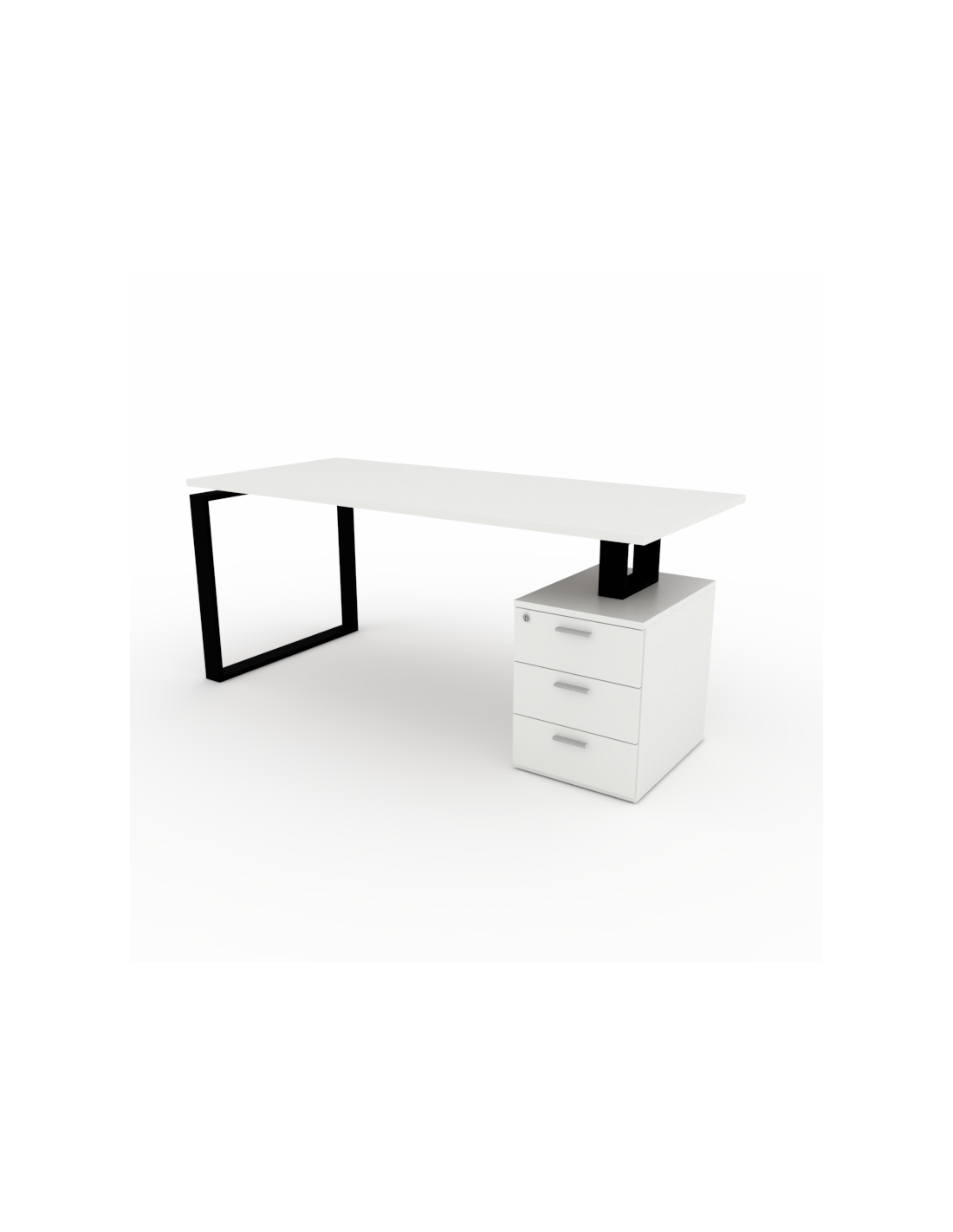 | Mesa | Tapa de la mesa fabricada con un tablero canteado y laminado de 25mm de espesor. Estructura metálica con pata de marco cerrado más soporte, fabricadas en tubo con una sección de 80x20mm y vigas rigidizantes bajo la tapa de la mesa. La mesa se apoya en una cajonera de 3 cajones de 19mm de grosor y 8mm la parte trasera. Incorpora guías zincadas con rodamientos de bolas y sistema de cierre con cerradura en el primer cajón. Se puede añadir la posición de la cajonera: izquierda o derecha. |