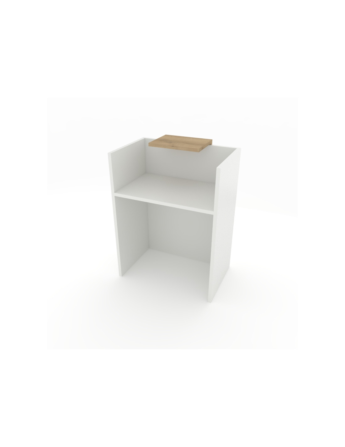 Mostrador Fabricado con panel de partículas aglomeradas de 19 mm de grosor revestidas por ambos lados con papel decorativo impregnado en resinas melamínicas. En color roble o blanco.