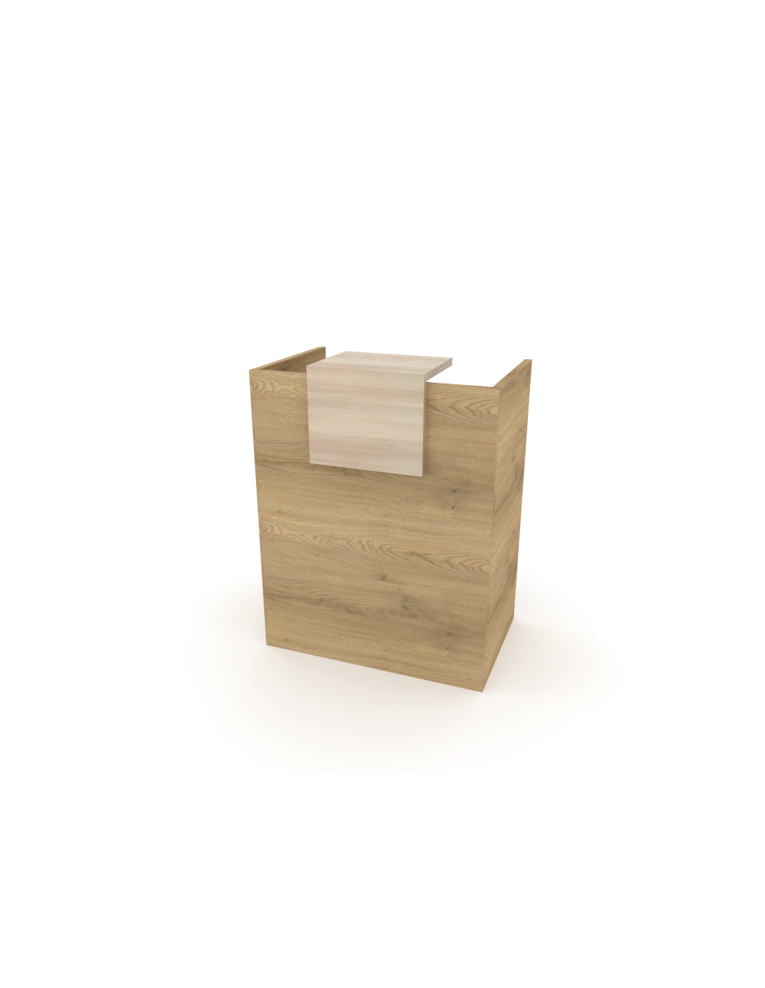 Mostrador Fabricado con panel de partículas aglomeradas de 19 mm de grosor revestidas por ambos lados con papel decorativo impregnado en resinas melamínicas. En color roble o blanco.