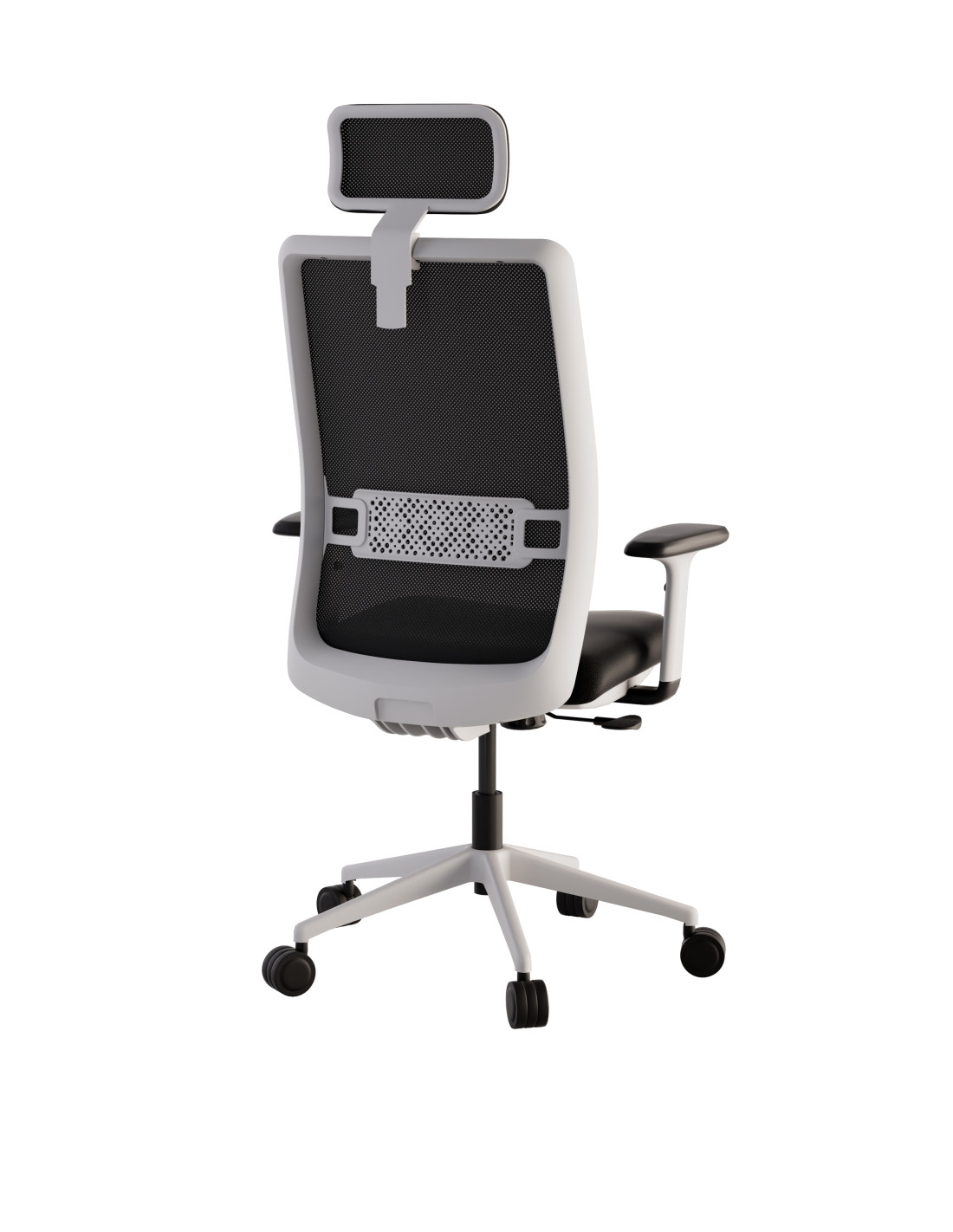 La silla EVOS WHITE CABEZAL ofrece un equilibrio ideal entre diseño moderno y confort. Su respaldo de malla transpirable mejora la circulación del aire, mientras que su asiento acolchonado con tejido de alta densidad garantiza el soporte necesario para trabajar cómodamente durante horas. Los reposabrazos ajustables se adaptan a tu postura, junto con el cabezal de malla regulable en altura, y su base resistente con cinco ruedas permite un desplazamiento estable y fluido. Con ajuste de altura y función reclinable, esta silla es perfecta para oficinas, espacios ejecutivos y home office. Eleva tu experiencia de trabajo con una combinación de ergonomía y estilo.