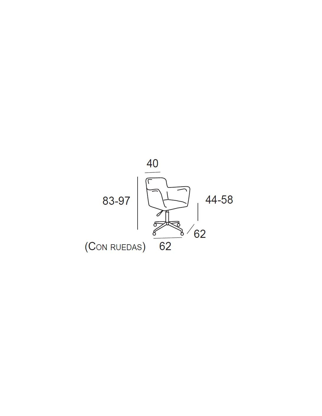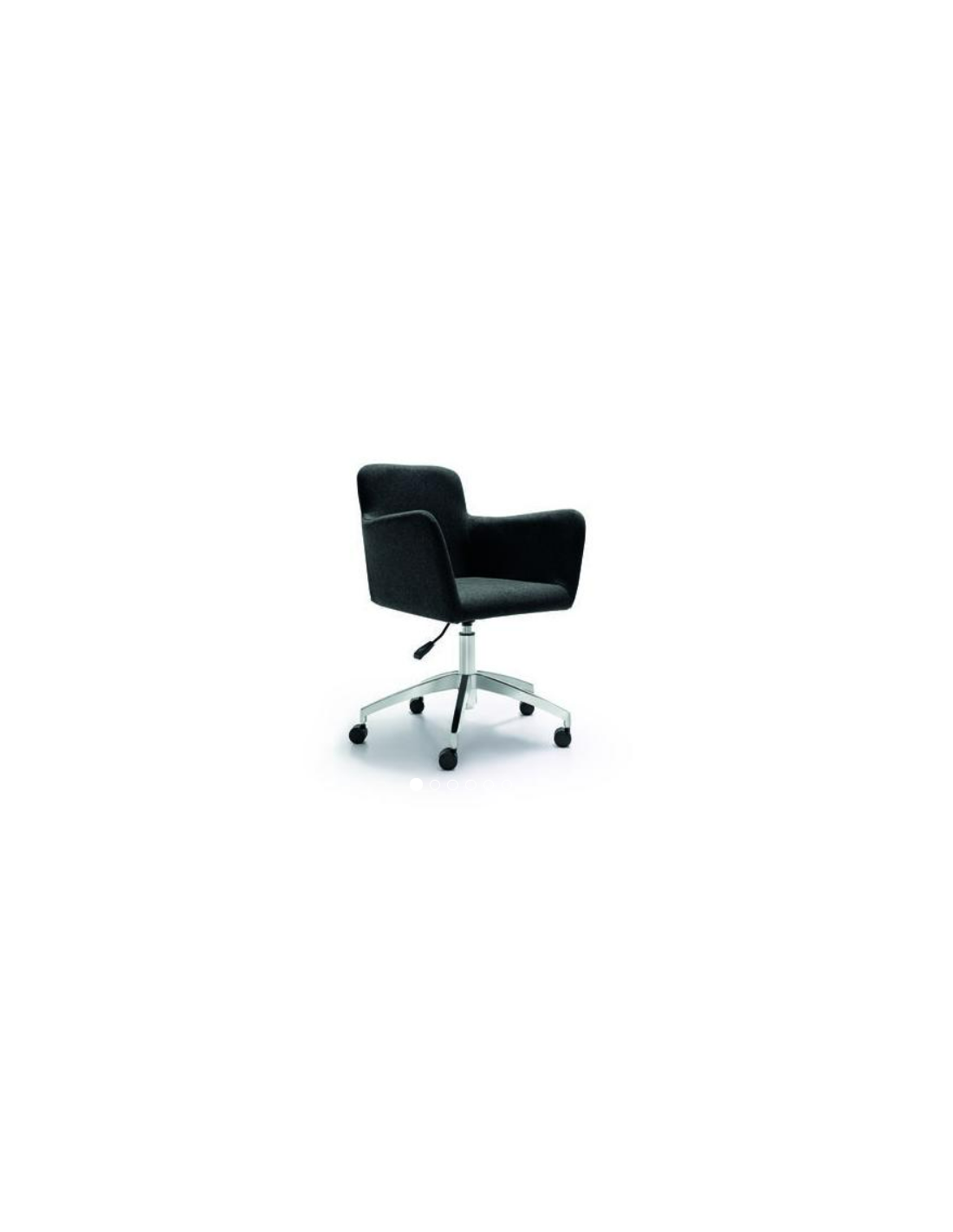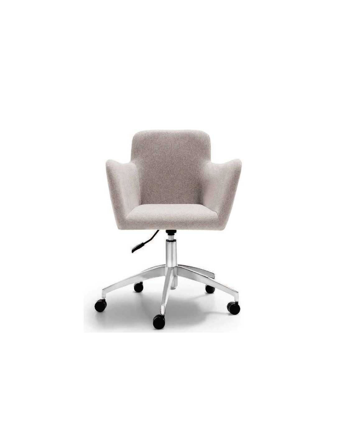 Silla giratoria de oficina para su uso como silla operativa, también como confidente, salas de reunión y para salas de espera. Con un diseño actual y colores neutros que puede acoplarse a cualquier entorno de oficina, tanto de estilo más conservador, como para más vanguardista por el estilo moderno de la imagen que transmite. Armazón interno de madera, con brazos formando parte de la propia estructura. y elevable en altura.
