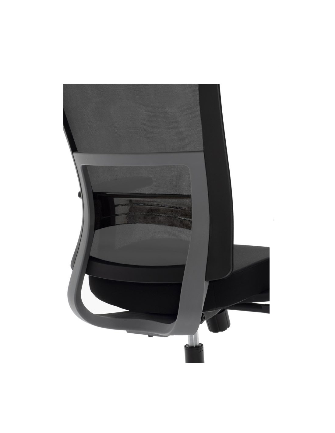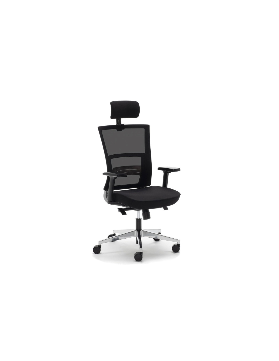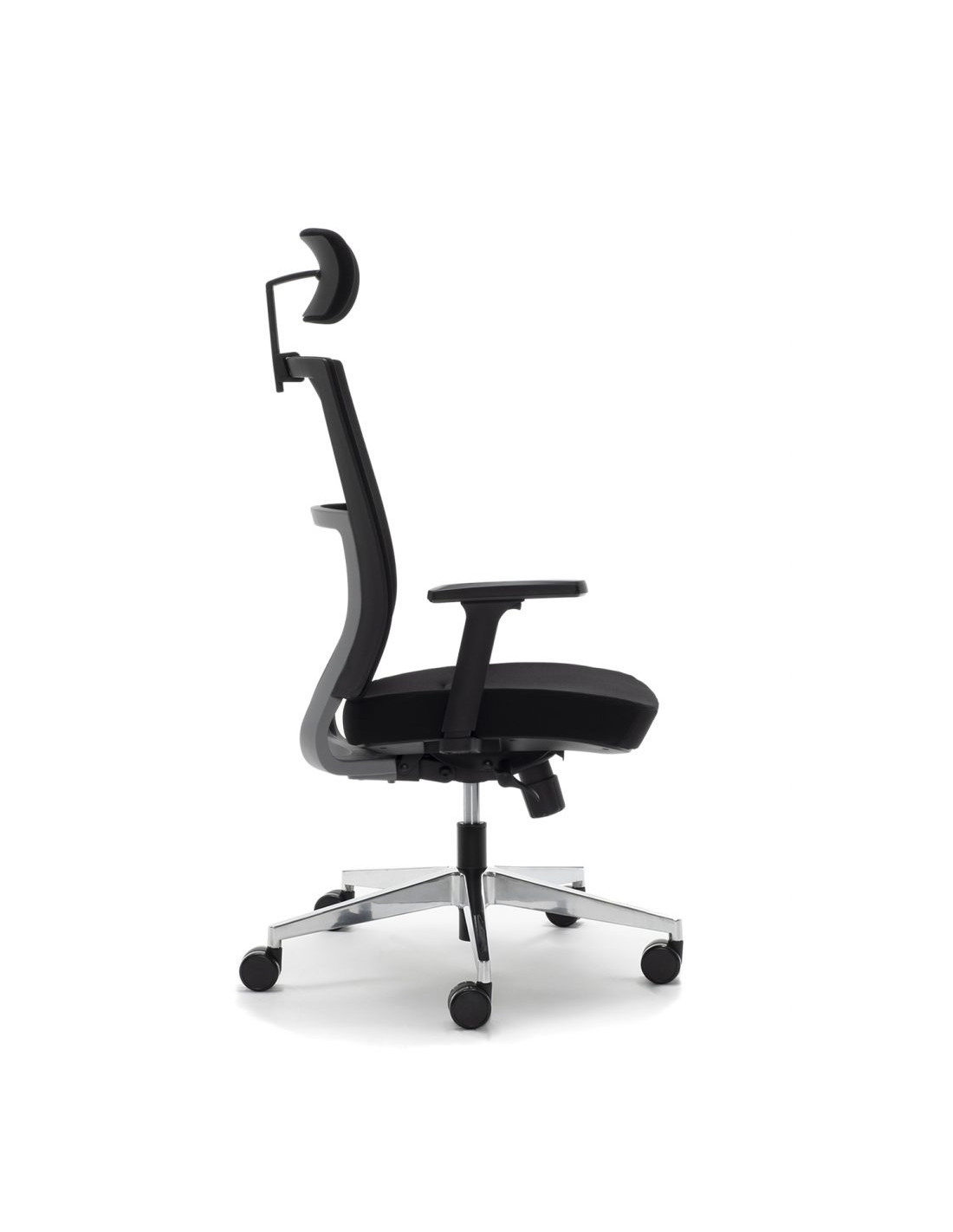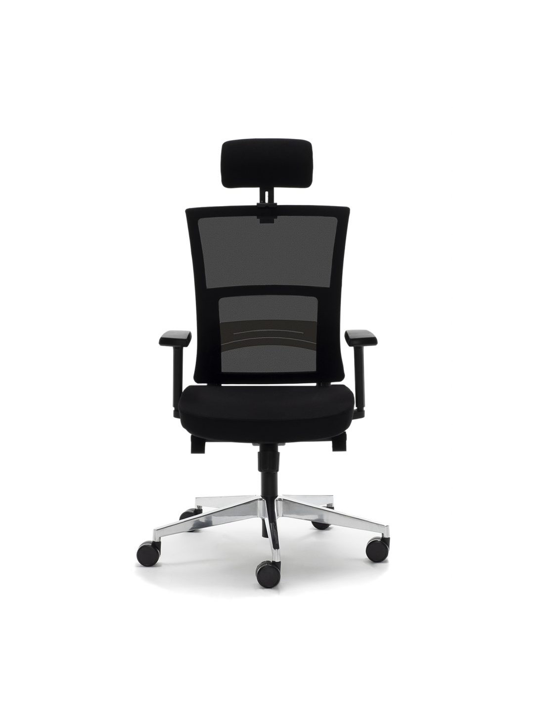 Silla para oficina, con ruedas, y unas prestaciones que la hacen ser un modelo con una estética moderna y muy elegante, para despachos de dirección o como silla operativa. Con un cabezal regulable en el respaldo de malla, que le dan una estabilidad y transpiración muy acertada para una silla de oficina en la que permanecemos sentados durante largas jornadas de trabajo.