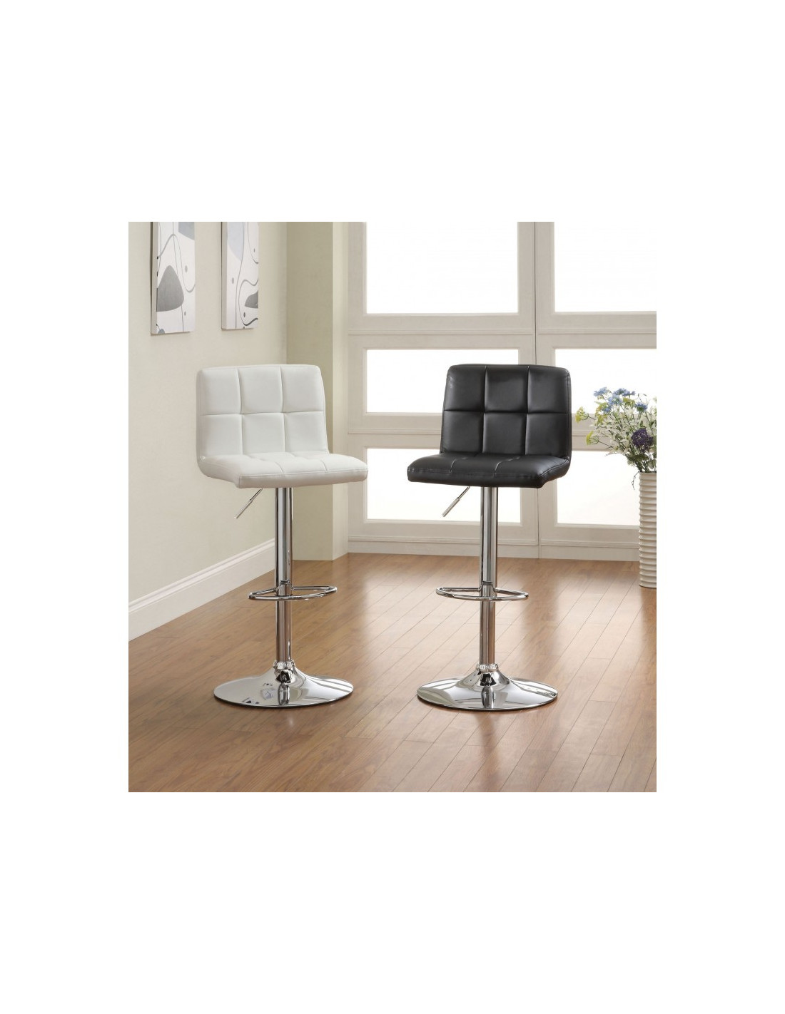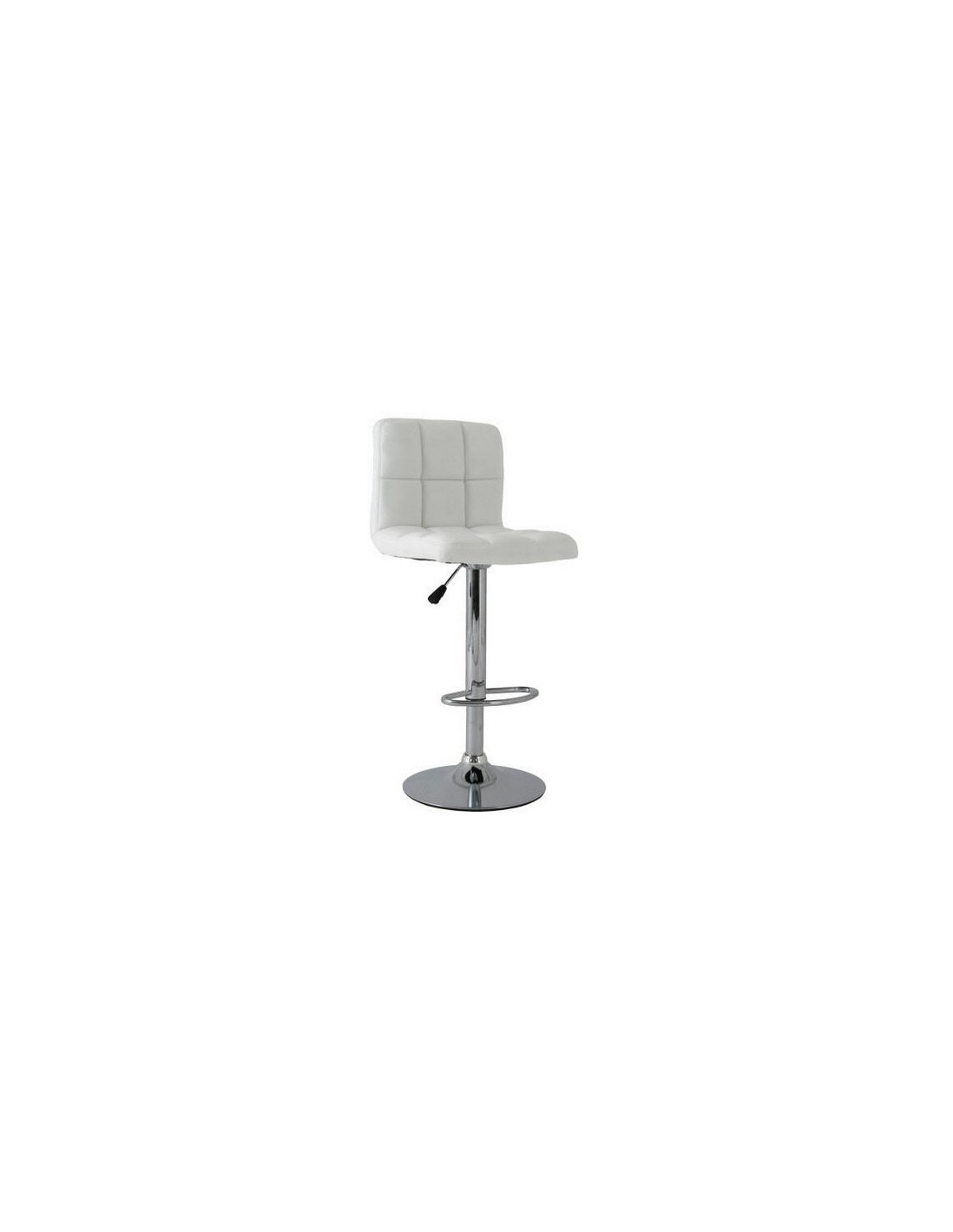 Taburete elegante. Destaca por su estructura metálica cromada resistente. Es regulable en altura, gracias a su pistón de gas, que permite acomodarlo a cualquier necesidad. Cuenta con reposapies integrado, y una base de plato cromada que proporciona estabilidad. Asiento tapizado en similpiel de alta calidad.